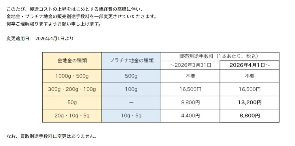 金地金・プラチナ地金の販売別途手数料変更のお知らせ(4/1より)